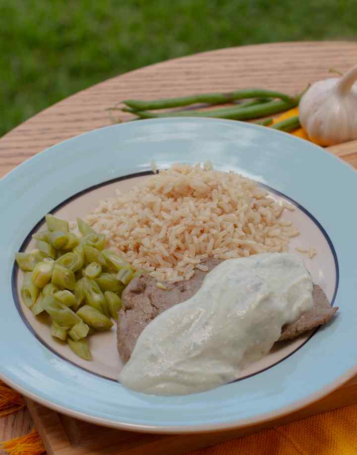 Ingredientes: Filé mignon, queijo gorgonzola, arroz, vagem, leite desnatado, maisena, alho e sal.