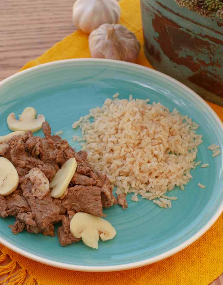 Ingredientes: Filé mignon, arroz integral, champignon, vinho tinto, alho, cebola e sal.
